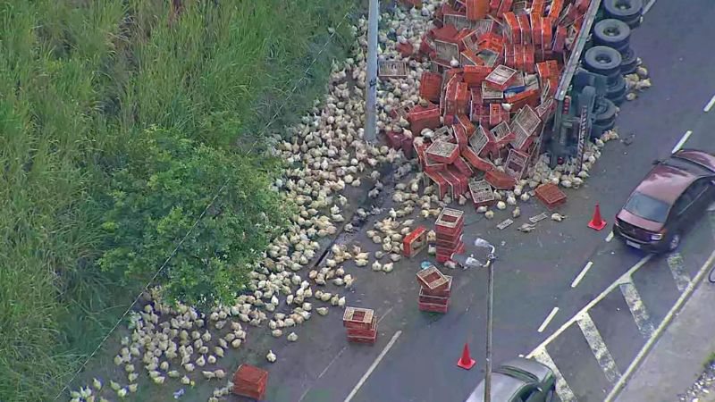 Caminhão com galinhas vivas tomba e populares levam aves; veja vídeo
