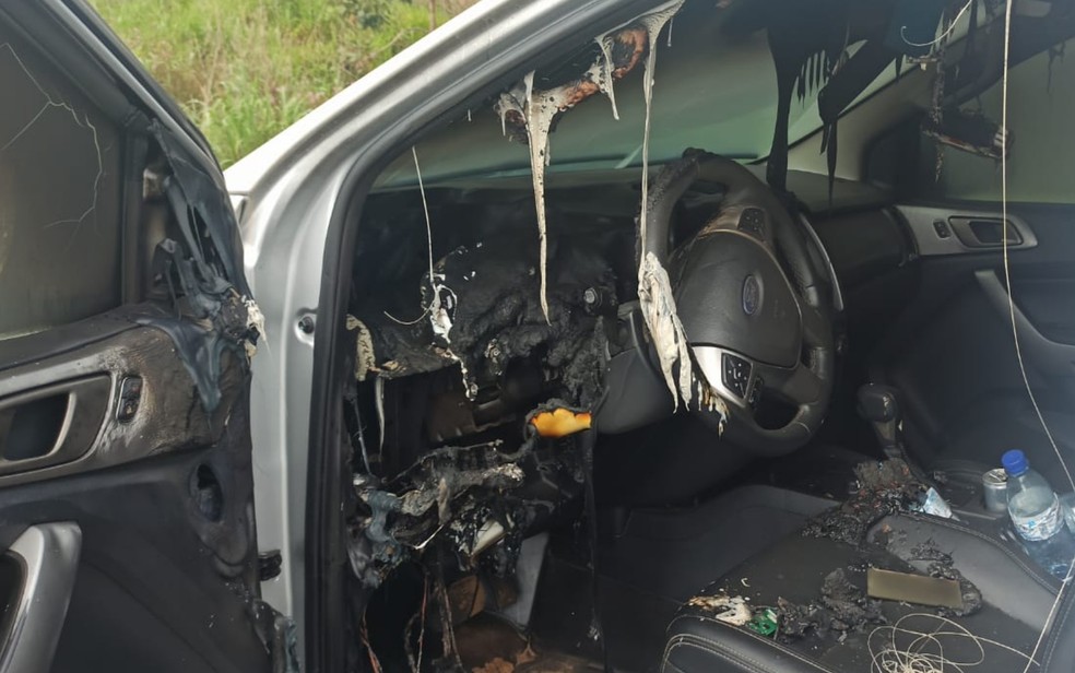 Caminhonete fica ‘derretida’ por dentro após ser atingida por raio em rodovia de Goiás; vídeo mostra estragos