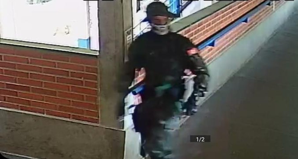 Homem foi flagrado por uma câmera de segurança em um supermercado; nas imagens o suspeito escolhe um jogo de facas na prateleira