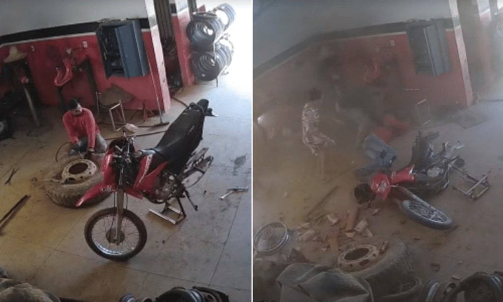 Uma câmera de segurança instalada na borracharia registrou a situação