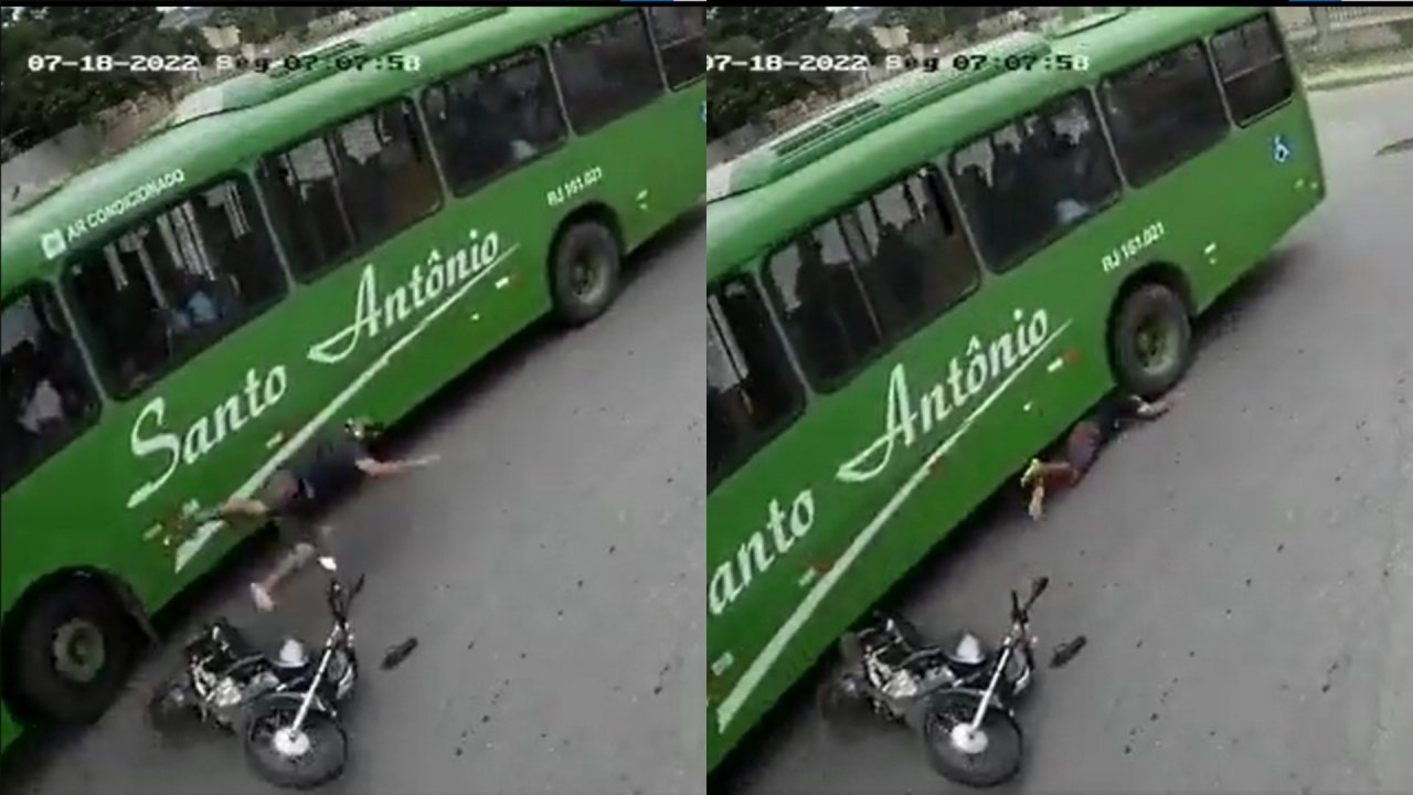 VÍDEO IMPRESSIONANTE: ‘Foi Deus’, diz motoqueiro salvo por capacete depois de cair e ir parar embaixo da roda de um ônibus
