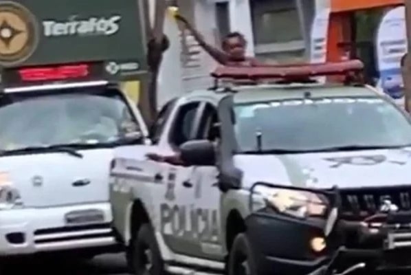 Mulher se empolga e dança em cima de viatura da PM com latinha de cerveja; VÍDEO