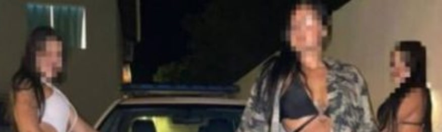 Mulheres posam com trajes de banho ao lado de viatura da Polícia Civil