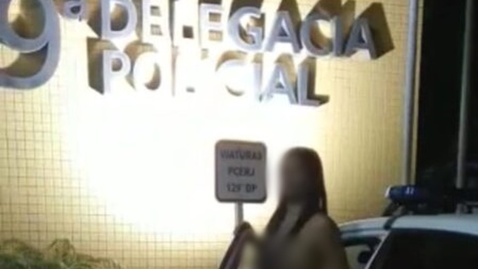 Em uma das imagens, que viralizaram em grupos de mensagens e redes sociais nesta terça-feira (28), a mulher aparece saindo de uma viatura estacionada no pátio da delegacia.