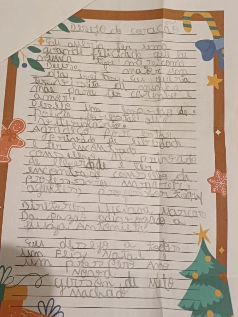 Com o tema “Desejo do Coração”, Gerson desejou ter um emprego de policial florestal ou veterinário. Ainda na carta, o jovem também desejou receber a visita da mãe para ter carinho e amor.